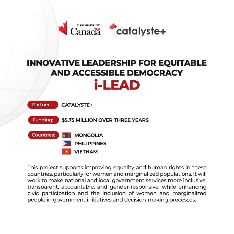 Canada launched the Innovative Leadership for Equitable and Accessible Democracy (i- LEAD) project with CatalystePlus—a $5.75 million investment over three years to support Mongolia, the Philippines, and Vietnam.